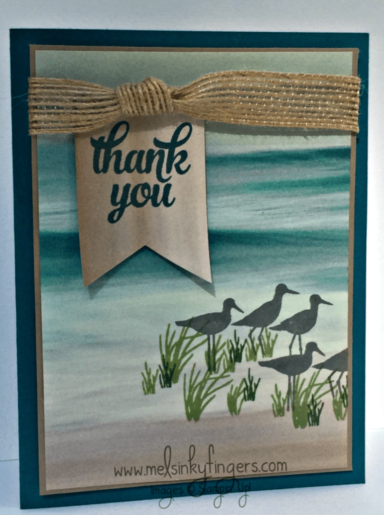 Creating this card is simple. I started with a piece of designer series paper cut to 3 3/4" x 5". I stamped the birds in Basic Gray, than added Wild Wasabi and Garden Green tufts of grass around their legs. I mounted it to a layer of Sahara Sand cardstock cut to 3 7/8" x 5 1/8". I added some Burlap Ribbon, with a simple knot, to the front, and adhered that all onto a 4 1/4" x 5 1/2" Island Indigo card base using dimensionals. The Tin of Cards stamp set on page 86 of the Annual catalog has sentiments in one of my favorite fonts, and I thought this Thank You was perfect! I stamped it in Island Indigo on a scrap of the same designer series paper as the background, cut to 1 1/2"x2", and again used dimensionals to adhere it under the knot. Done!