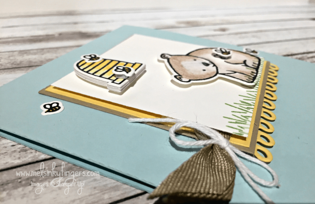 It goes so well with this adorable little bear in the A Little Wild stamp set. I have had fun playing with the bundle this week. And those bees in the coordinating Little Loves framelits die set…..I am in love with them!