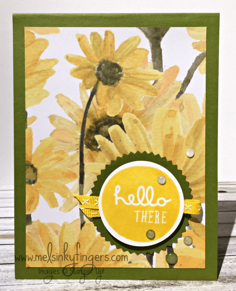 Today I am featuring a card using the very popular designer series paper pack, Delightful Daisy. It coordinates with the Daisy Delight stamp set and Daisy punch, however, today I have paired it with the adorable stamp set, Pieces & Patterns, which has this fun circle sentiment stamp.