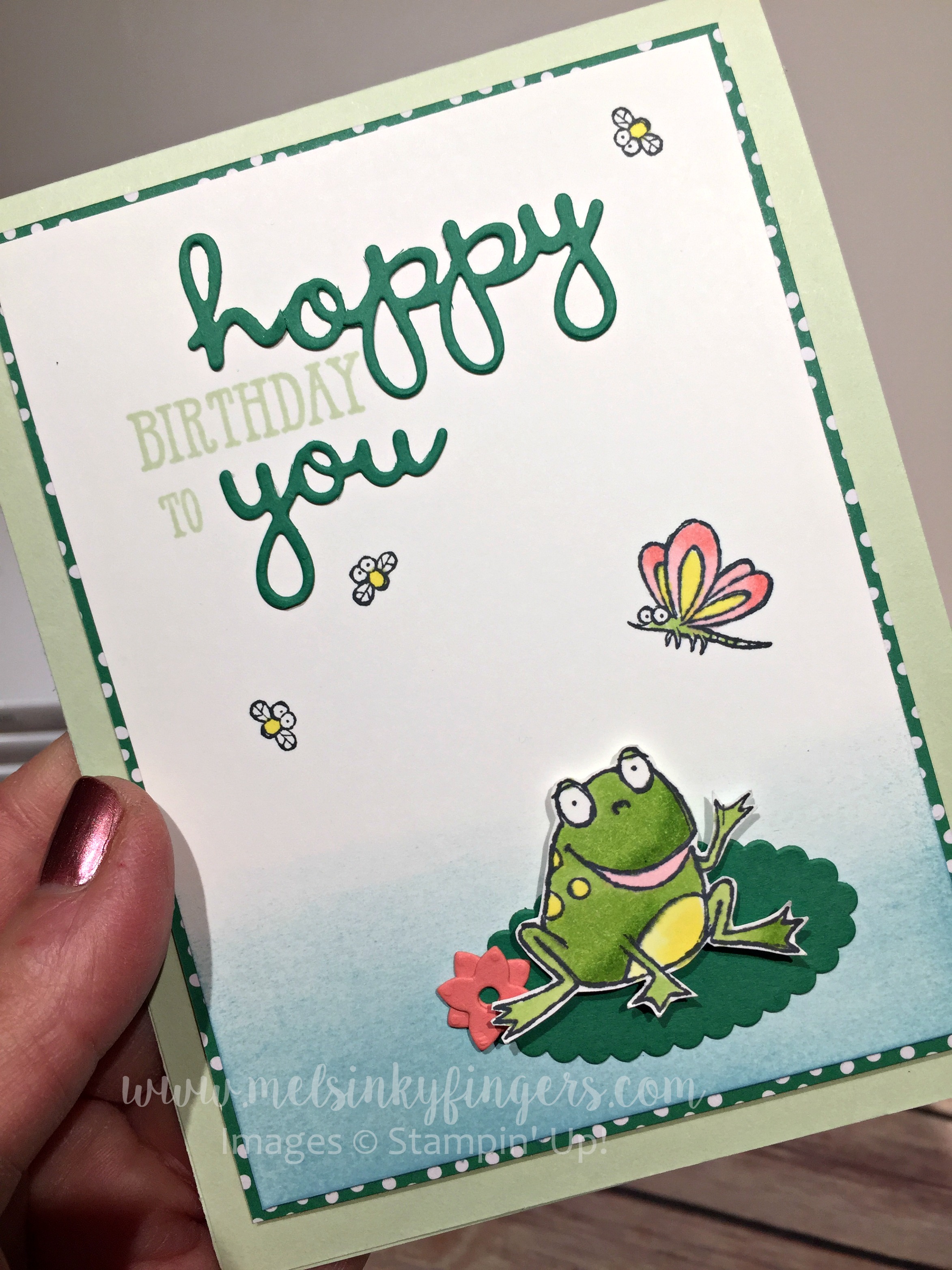 I used a sponge brayer with Pool Party ink to add a bit of color along the bottom edge of the Whisper White layer, than added the lily pad, which was cut using the Layering Ovals framelits. After stamping the frog, I colored him with Granny Apple Green and Pineapple Punch Blends, did a little fussy cutting, and put him on his lily pad with a dimensional. A Flirty Flamingo flower cut from the Well Written dies was the perfect accent on the lily pad.