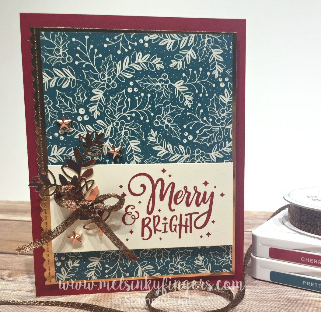 I chose to use the gorgeous Brightly Gleaming designer paper with all things copper – copper metallic elements, copper stars, and copper trim. And my favorite, a layer of copper foil paper to pull it all together!