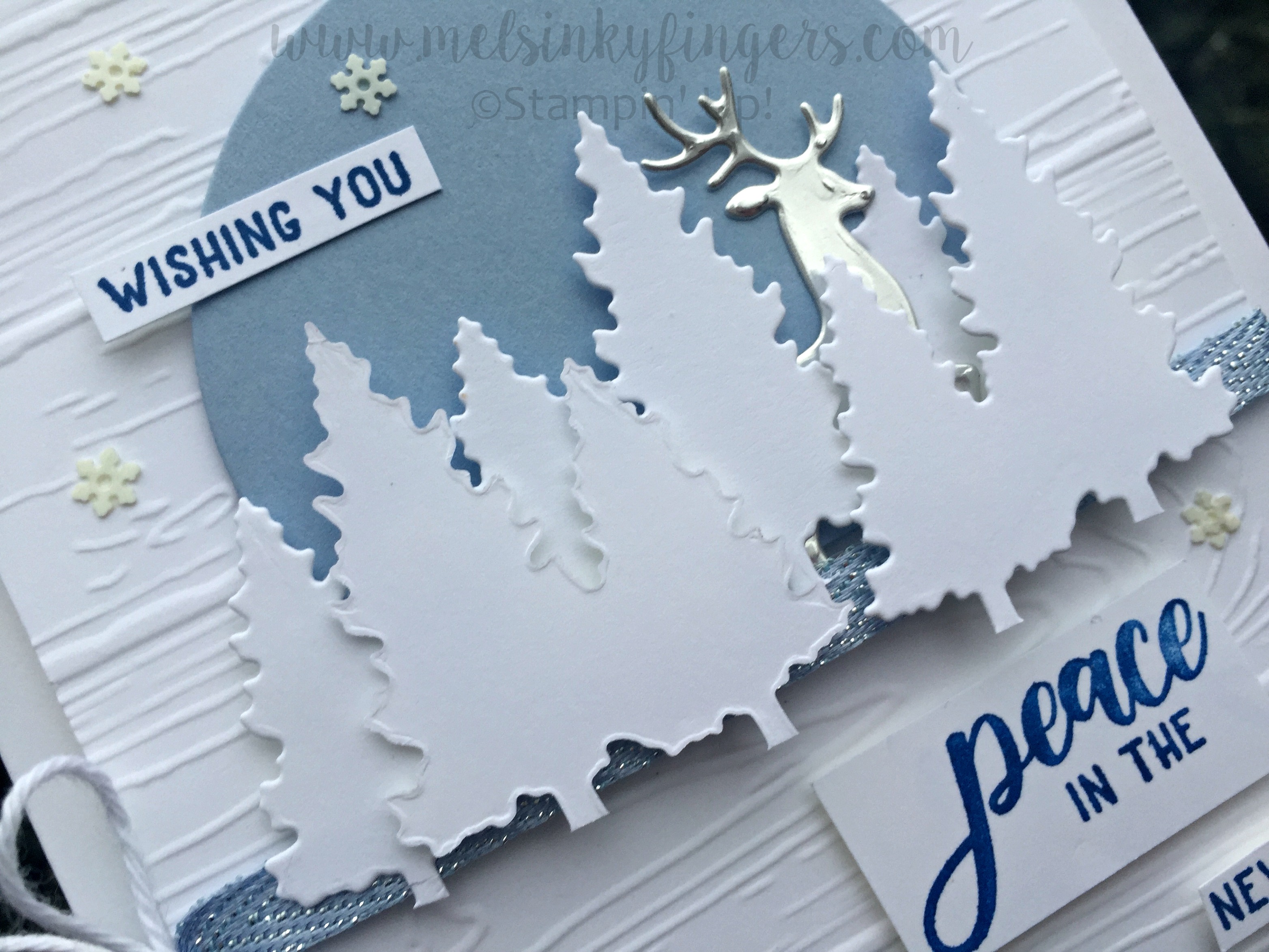 Tie a piece of Seaside Spray Metallic ribbon around embossed white layer using a piece of white twine, than adhere to card base. Adhere the semicircle near the center. Layer trees and deer die cut onto card front, using layered dimensionals to create depth. Color portions of the sentiment with a Blueberry Bushel Stampin' Write Marker, and stamp. Cut out words with paper snips, and adhere to card front to create a custom sentiment. Embellish with Snowflake Sequins, and add inside sentiment.