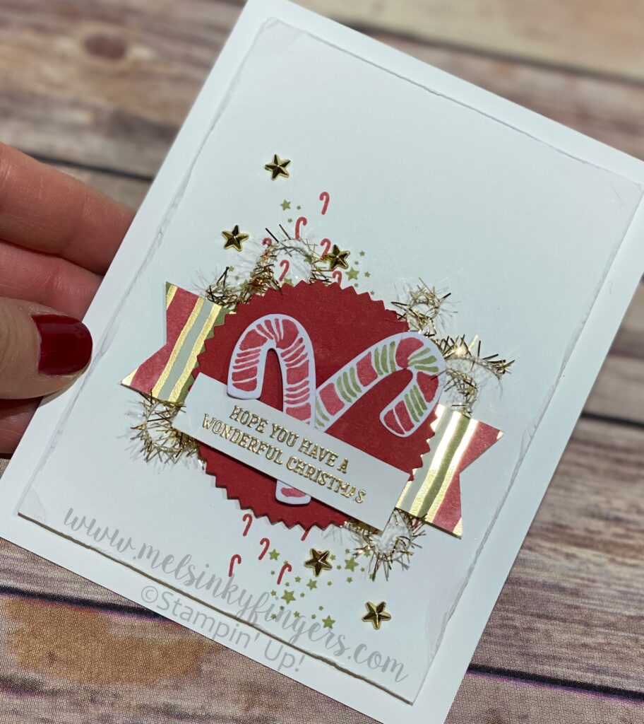 I stamped the background with the candy cane stamps in Real Red ink, and the stars in Pear Pizzazz ink, than layered a strip of the beautiful gold foil designer paper with a starburst punch out. That fun gold/white tinsel trim comes in the product medley! And those gorgeous 3D gold metalic stars do as well.