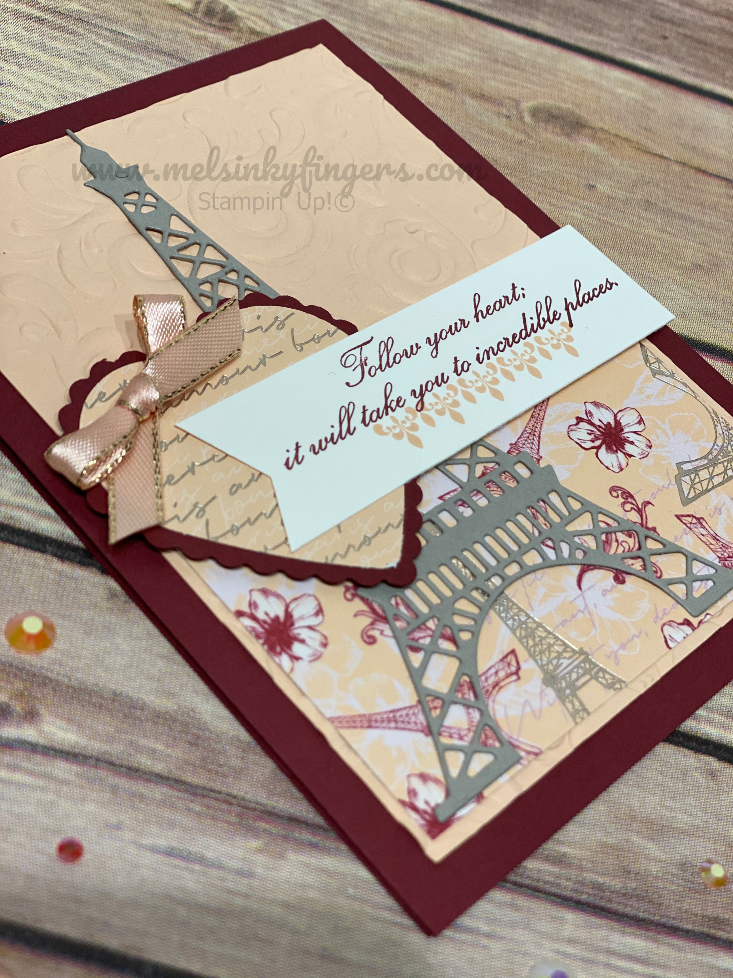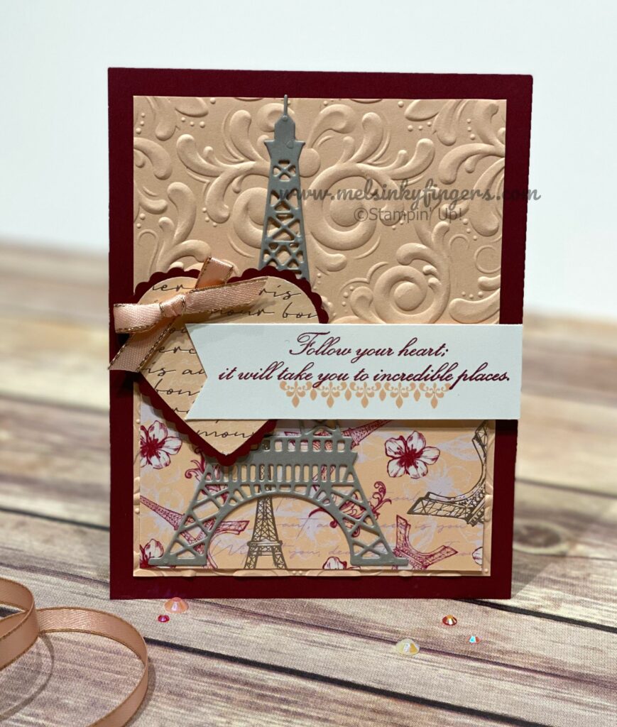 Layer the designer paper and Petal Pink embossed layer onto the card base. Die cut an Eiffel Tower and adhere to card front. Add a punched heart layered onto a scalloped heart punch, and place over tower. Stamp sentiment in Merry Merlot ink with Petal Pink detail below, and adhere to card front with dimensionals, covering the top edge of designer paper. Add a Petal Pink ribbon bow.