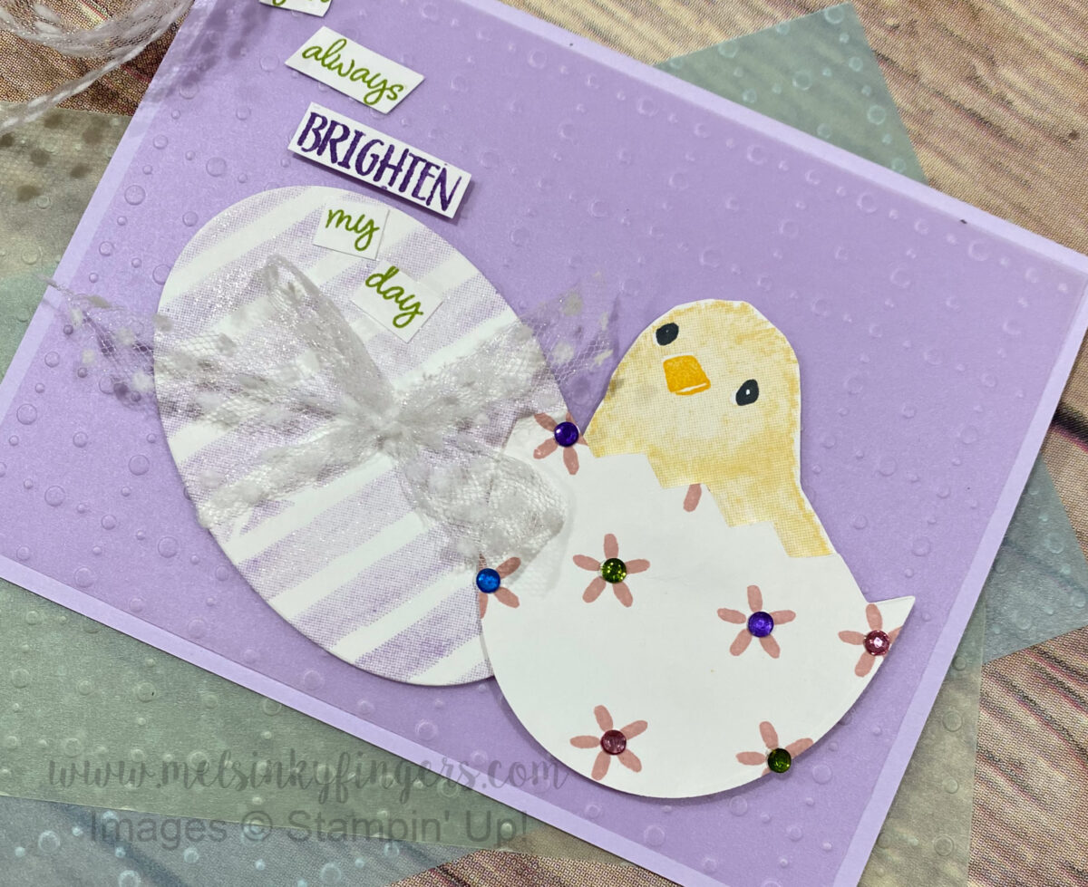 Adhere vellum to card base. Stamp strips twice in Highland Heather ink, stamped of once. Color the stripes with Wink of Stella, than die cut with a matching oval die. Die cut the cracked egg with die from the Dino die set. Repeatedly stamp the small flower from Full of Happiness in Blushing Bride ink. Add Noble Peacock Rhinestones to flower centers. Stamp chick in Daffodil Delight ink, add Mango Melody beak and Black eyes. Fussy cut, and adhere behind cracked egg. Tie pokla dot ribbon around full egg, and arrange eggs on card front. Stamp sentiment in Granny Apple Green and Gorgeous Grape. Cut out the words, and arrange as desired on card front.