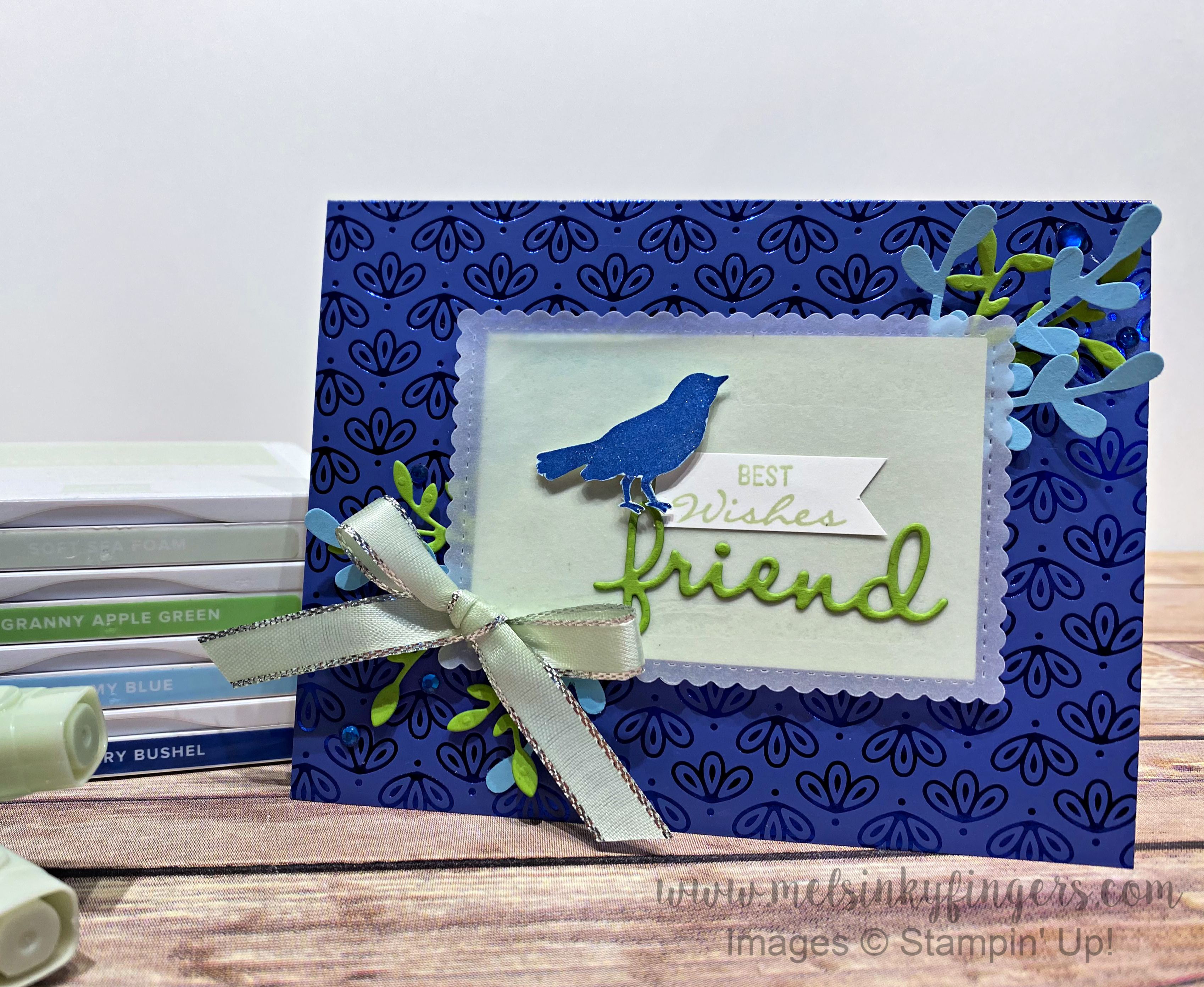 Adhere the Soft Sea Foam layer behind the vellum scalloped rectangle and adhere to card front. Stamp sentiment in Soft Sea Foam ink on Whisper White cardstock, fussy cut and adhere to rectangle. Die cut 'friend' in Granny Apple Green cardstock using the Well Written dies and adhere beneath sentiment. Stamp bird in Blueberry Bushel ink, color with Wink of Stella, fussy cut, and adhere sitting on word. Arrange die cut branches and punched sprigs behind rectangle and adhere in place. Color a piece of metallic trimmed ribbon with a Soft Sea Foam Blends marker, tie in a bow, and adhere to rectangle. Embellish as desired with None Peacock Rhinestones. Stamp inside sentiment in Soft Sea Foam ink.